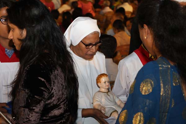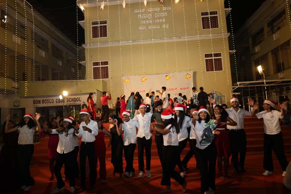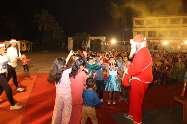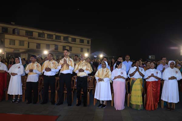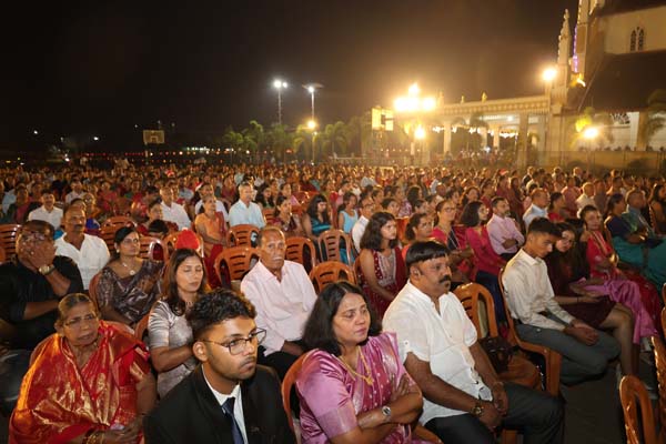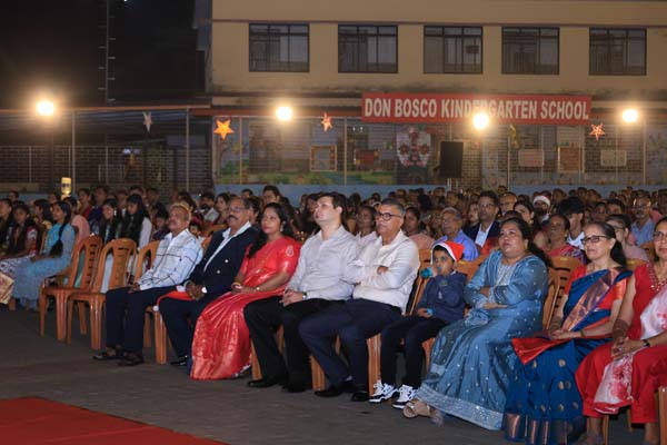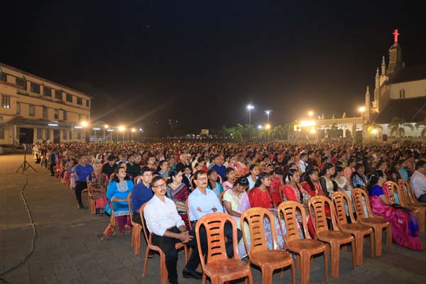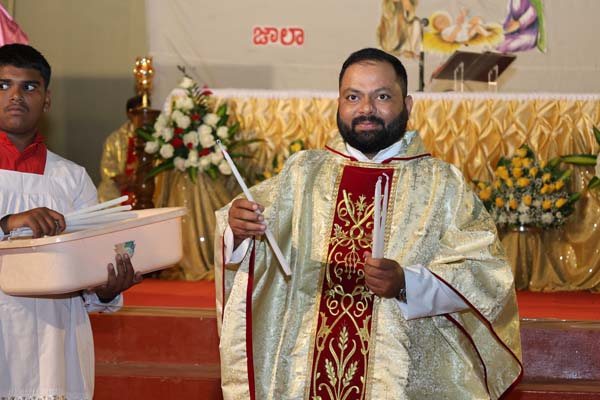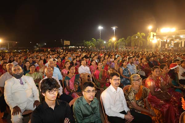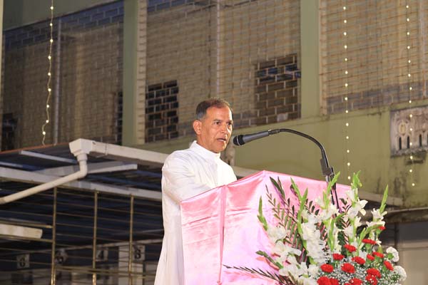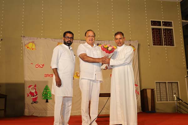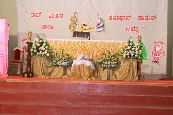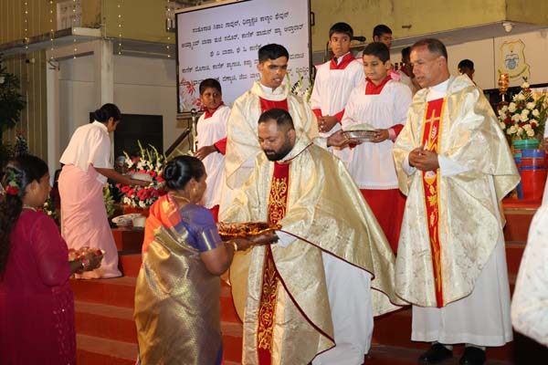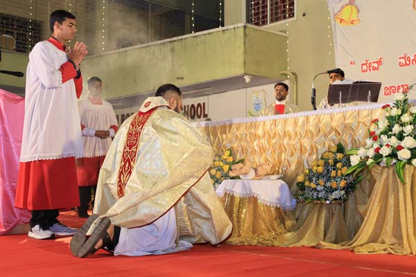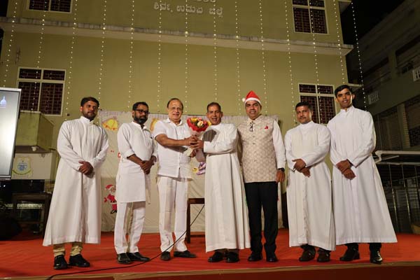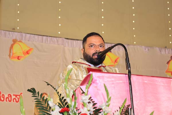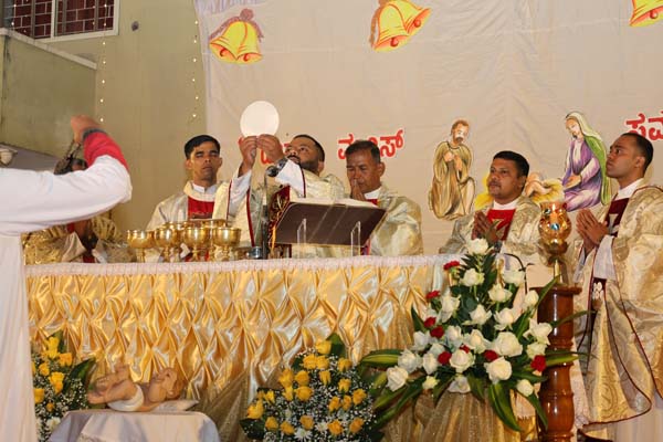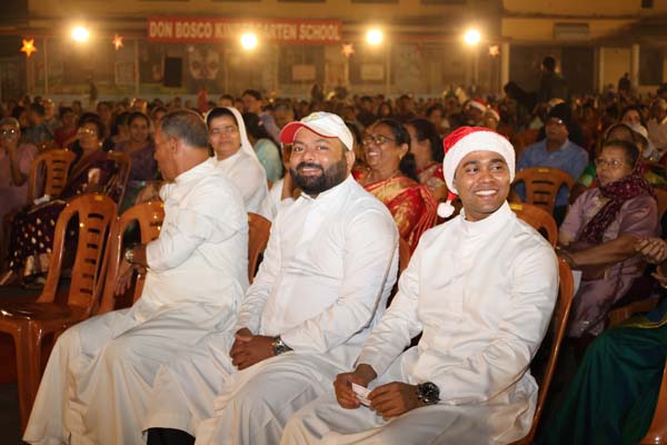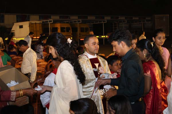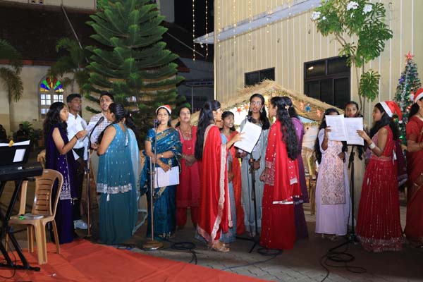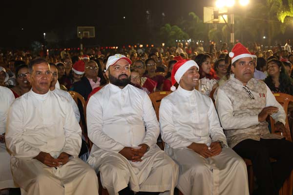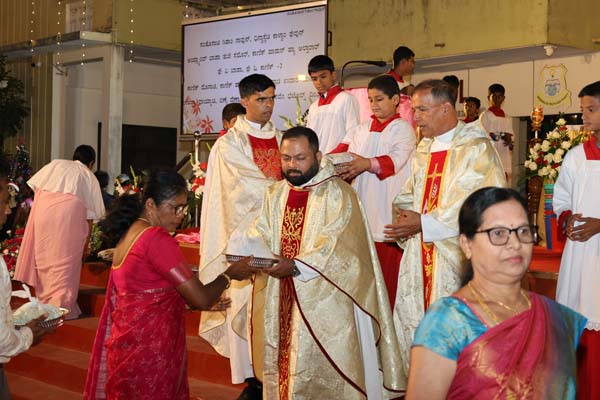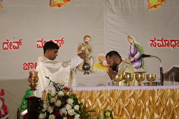 The solemn Christmas Eve Mass was the central event of the evening, with Rev. Fr. Roshan D’Cunha, YCS Director, Mangalore Diocese as the main celebrant. He was concelebrated by V. Rev. Fr. Dr. Leslie D’Souza, Rev. Fr. Rolwyn Aranha, Rev. Fr. Anil Rodrigues, Rev. Fr. Roshan D’Souza SDB and Fr. Royal Fernandes SDB. The liturgy was marked by reverence and active participation from the large gathering of parishioners.